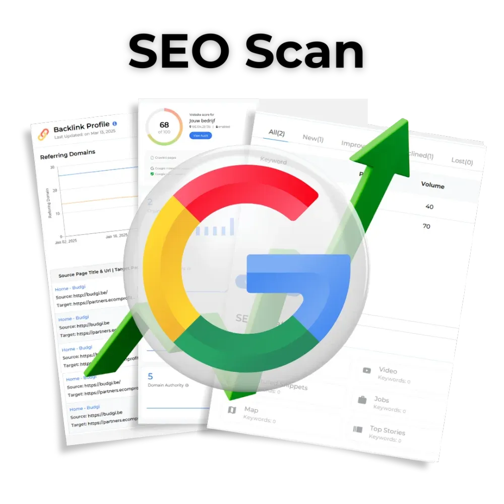 De Google BusinessScan is een gratis SEO-analyse van jouw website. Je ontvangt een overzichtelijk rapport met concrete verbeterpunten om beter gevonden te worden in Google. Denk aan technische fouten, zoekwoordoptimalisatie, lokale vindbaarheid en je concurrentiepositie.